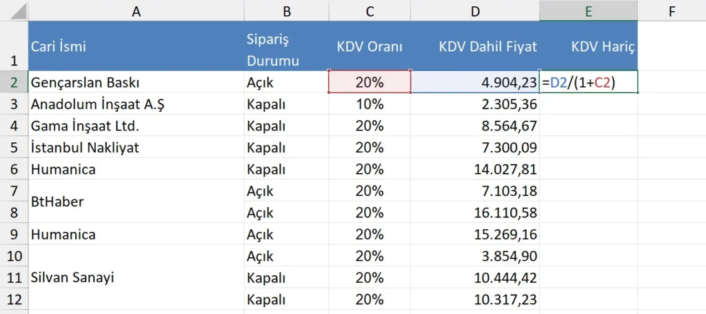 Excelde KDV Hesaplama ve Matrah Bulma Formülleri