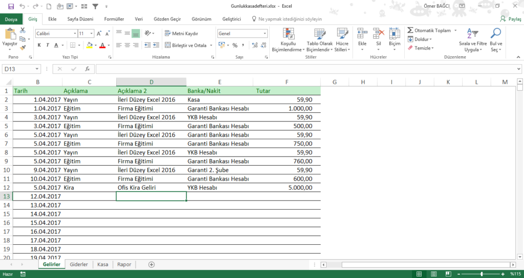 Excel ile Basit Günlük Kasa Defteri Oluşturma Adım Adım